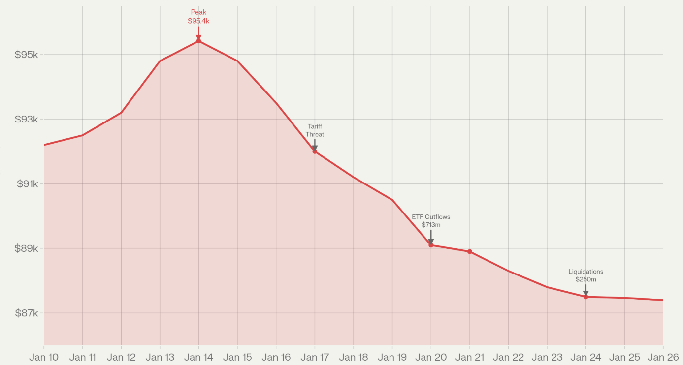 비트코인은 1월 중순 $95,419에 달했던 고점에서 1월 25일 $87,471까지 급락했으며, 이는 일주일 동안 약 7%의 낙폭입니다. 이번 하락은 단순한 기술적 조정이 아니라 세 가지 거시경제적 충격이 동시에 발생한 결과입니다. 트럼프 대통령의 그린란드 인수 관련 유럽에 대한 관세 위협, 미국 정부 셧다운 위험, 그리고 연방준비제도의 금리 정책에 대한 불확실성이 복합적으로 작용했습니다.