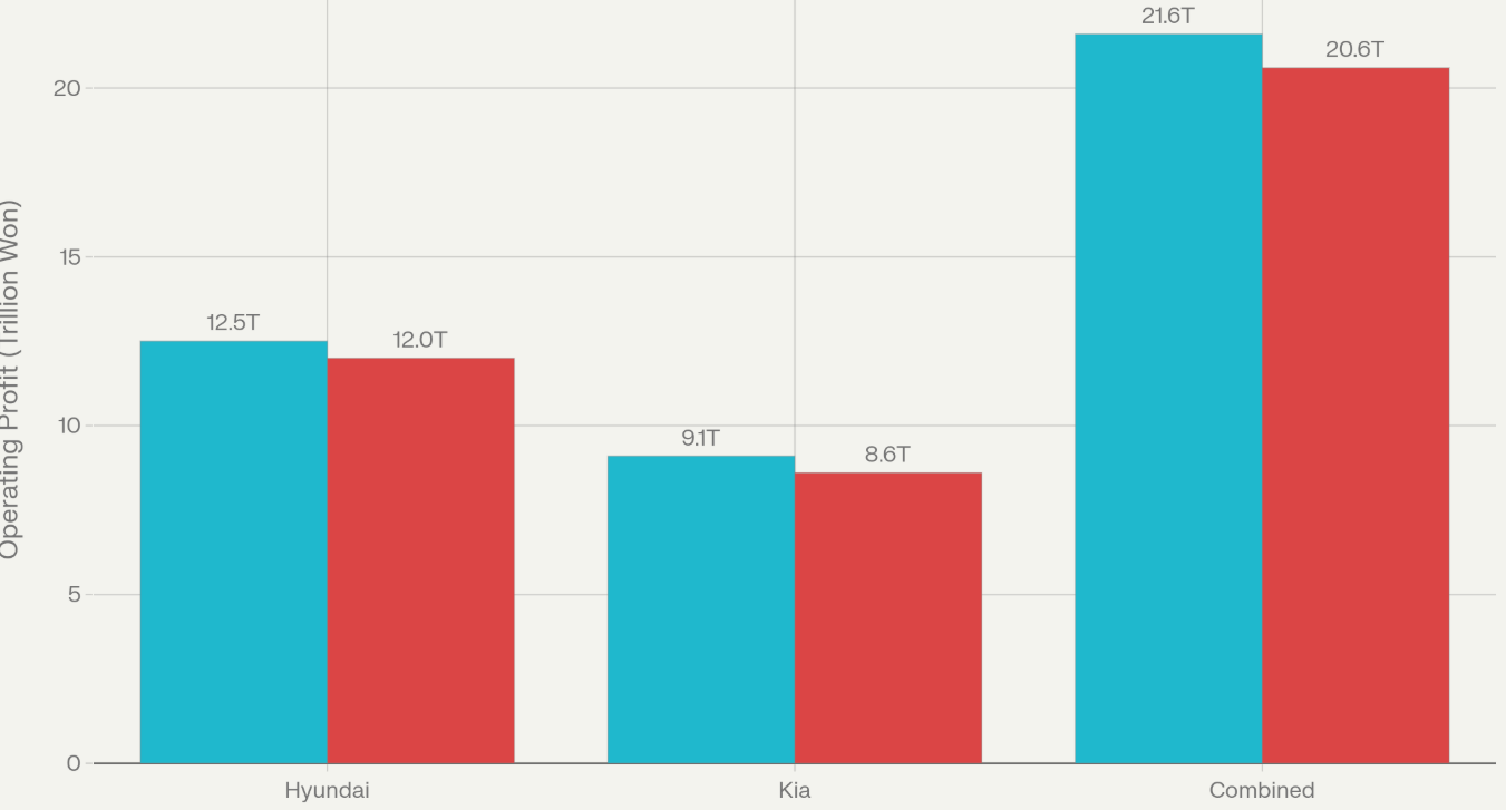 2025년 현대차의 연간 영업이익은 12.5조 원 수준으로 예상되는데, 이는 전년(14.2조 원) 대비 12.3% 하락한 것입니다. 기아차도 2025년 영업이익이 9.1조 원으로 28% 감소할 것으로 예상됩니다. 양사의 2025년 영업적자는 약 8.4조 원에 달합니다.