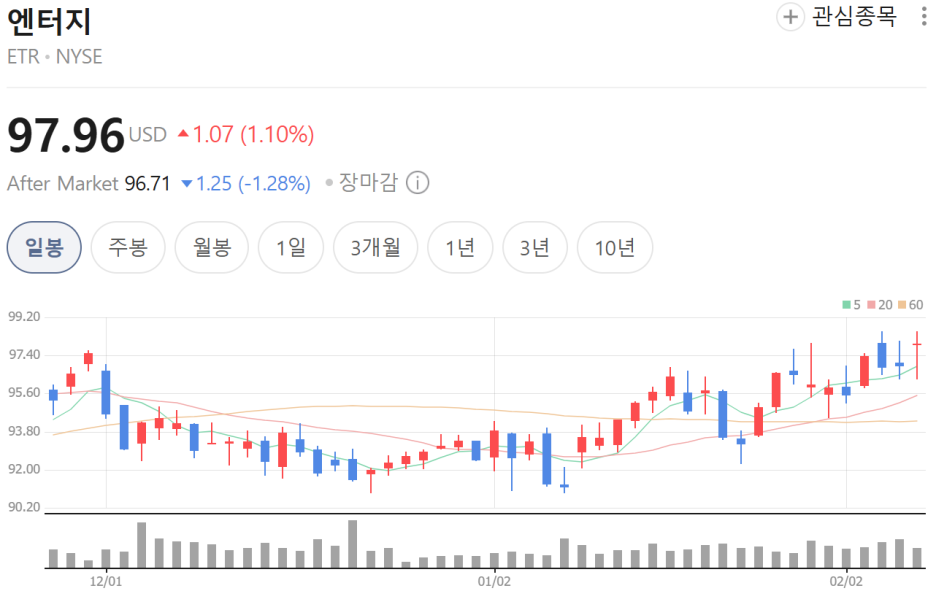Entergy는 미국 남부(아칸소, 루이지애나, 미시시피, 텍사스) 지역의 대형 전력회사입니다. 원자력, 천연가스, 신재생 발전소를 운영하며, 3백만 고객에게 전력을 공급합니다. 최근 데이터센터, 산업단지 등 대규모 전력 수요처에 맞춘 인프라 투자와, 원자력 발전의 청정 전력 공급 확대에 집중하고 있습니다.