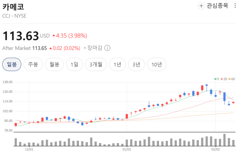 Cameco는 세계 최대의 우라늄 생산 및 공급 기업으로, 원자력 발전소의 핵연료를 전 세계에 공급합니다. AI 데이터센터 및 산업용 전력 수요 증가에 따라, 원자력 발전의 역할이 재조명되고 있으며, Cameco는 차세대 원전 및 소형 모듈 원자로(SMR) 시장에서도 핵심 연료 공급자로 부상하고 있습니다. 최근 Westinghouse Electric Company 인수 등 원자력 밸류체인 확장에도 적극적입니다.